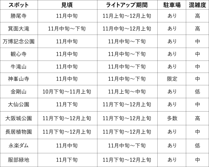 歴史ある寺院の荘厳なライトアップ(勝尾寺・観心寺・神峯山寺)、 自然と調和するダイナミックな紅葉(箕面大滝・金剛山)、 都会で気軽に楽しめる紅葉(大阪城公園・長居植物園・服部緑地)。