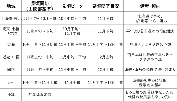 現在、気象会社・紅葉情報サイト等が発表している「見頃予想マップ」を総合すると次のような傾向が浮かびます。