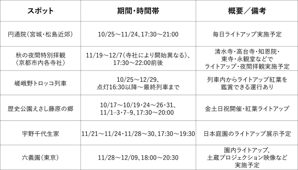 ライトアップ・イベント:紅葉ライトアップ情報は限定的。