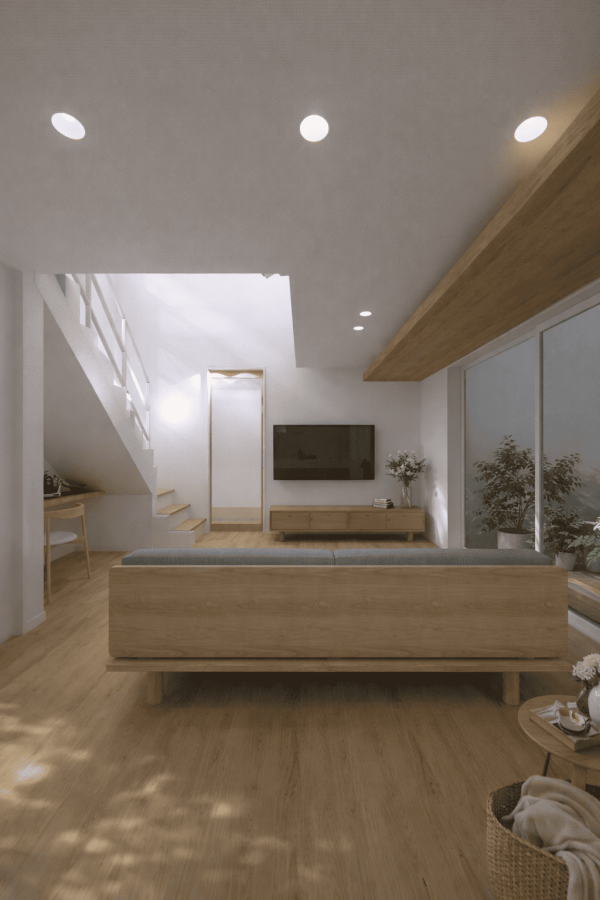 高窓から差し込む自然光が白い壁にやさしく反射し、時間帯によって変わる光の表情も楽しめます。