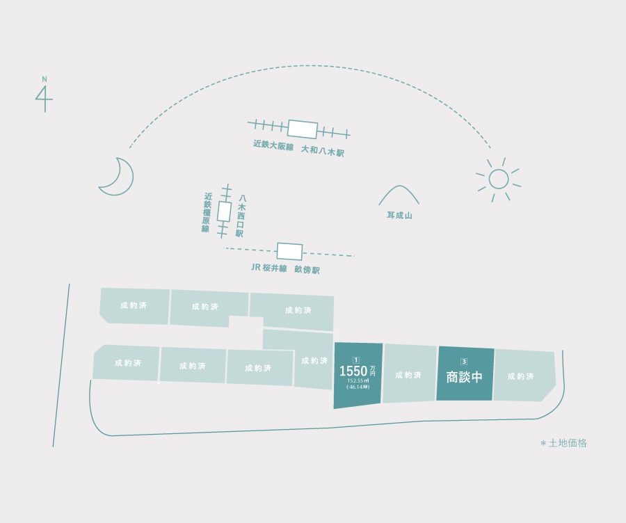 - 橿原市の中心地、大和三山の中央に位置する四条町に全11区画のスケールある街があります。南に進むと、初代天皇とされる神武天皇陵、二代天皇とされる綏靖天皇陵があり、広がる田畑や山々に緑と歴史を感じることができます。分譲地から国道166号線を越えると、今井町という昔ながらの街並みを大切にした地域があります。 かつては「大和の金は今井に七分」といわれるほど繁栄した今井町。重要伝統的建造物群保存地区に指定されており現在も町の大半の町家が大切に保存され、江戸時代の姿を残している橿原でも人気の地域です。春には街並み散歩、夏には花火会、秋には秋祭りなど季節のイベントがあり四季の移ろいを楽むことができます。 自然と、街と、家族とつながる。ツナギテラスで始まる生活をご提案します。